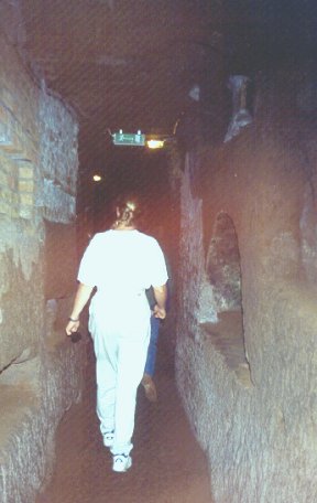 Rome is riddled with catacombs dating back to the 1st century AD. Some of the largest cover 90 acres of land with galleries 12 miles long. Many of the catacombs would be dug to 4 levels - about 66 feet deep. Popes to paupers could be buried in these tunnels. The bodies were usually wrapped in linen and put in niches carved out from the volcanic rock called tuffa. The chambers were sealed with marble slabs engraved with the person's name and occasionally an epitaph. Most catacombs are narrow and low roofed, however if space was needed the workers would simply dig down until another body could be accommodated. 500,000 Christians were buried here.