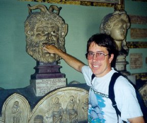 Although this statue is one a pontiff's sarcophagus, it is inspired by the Bocca Della Verita. It was used by the judges of Rome to see whether an individual was lying or not. When a person put his hand it the mouth and told a lie he would lose his hand. Many believe that the judges may have "helped" God to pass judgment when the thought the accused guilty. So Bob, are you having fun in Rome?