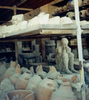 During the excavations archeologists found empty cavities which they did not understand. A small hole would be poked in the top of these cavities and cement poured in. When the volcanic rock was chipped away a cement cast of the space was revealed. These turned out to be figures of the people who died during the eruption. So precise are they, and so quickly did the people die, that the casts show the expressions of the individuals. To find out more about Vesuvius and Pompeii, click on the picture.