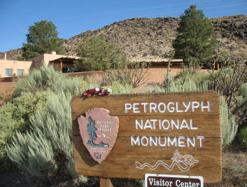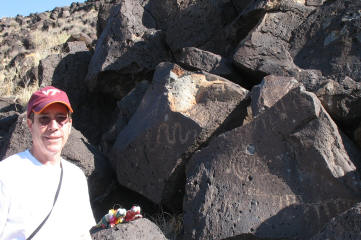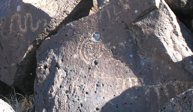 Before we headed out of Albuquerque, we stopped at the Petroglyph National Monument and walked part way around the 1 1/2 mile long Rinconada Canyon Trail. There were hundreds of carved drawings created by the Pueblo Indians and some Spanish settlers later on. Most of the images are 400 to 700 years old, although some may be as old as 2,000 years. Below and to the right is a close up of the petroglyphs Bob and K&K are standing by - a snake, two four-legged critters, and a spiral design. |