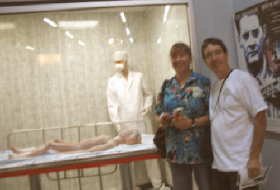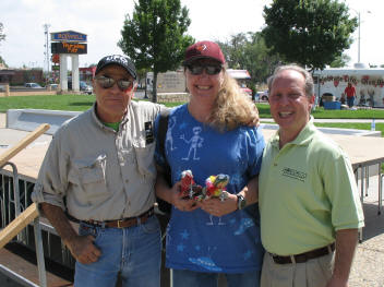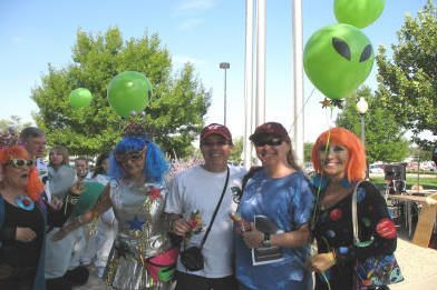 Looked like we were going to go to the opening ceremonies. Below, and to the left, is a shot of some of the people we met at the opening. To the right and below is a shot of William J. Birnes (the host of the UFO Hunters show on The History Channel & author of many UFO books), Amy & K&K, and Peter Robbins, a renowned author and speaker on the UFO phenomenon and cover-up theories. Scroll down for a condensed version of the history of Roswell and the UFO crash/conspiracy. |
