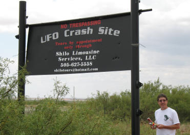 the brochure says, A local rancher saw an object crash in a canyon on his land and notified the authorities. The government officials first reported that they had discovered a "flying disk" at the crash site. After the Army and other "official officials" arrived, the story was reported as a "weather balloon" that had taken a wrong course and went down at (or near) the crash site. It is important to understand that the Roswell crash site is different from "Hanger 84" where the debris and alien bodies were transported after the crash of 1947. And very different from "Area 51" in Nevada where, it is said, the UFO technology (ships to bodies) were taken for study - including trying to "reverse engineer" their technology.