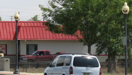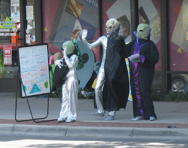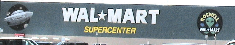 When we reached Roswell, our first stop was in the parking lot of WalMart. The building was painted with UFOs and alien heads - just had to get a picture of that! K&K found alien necklaces to wear - UFO gear! |